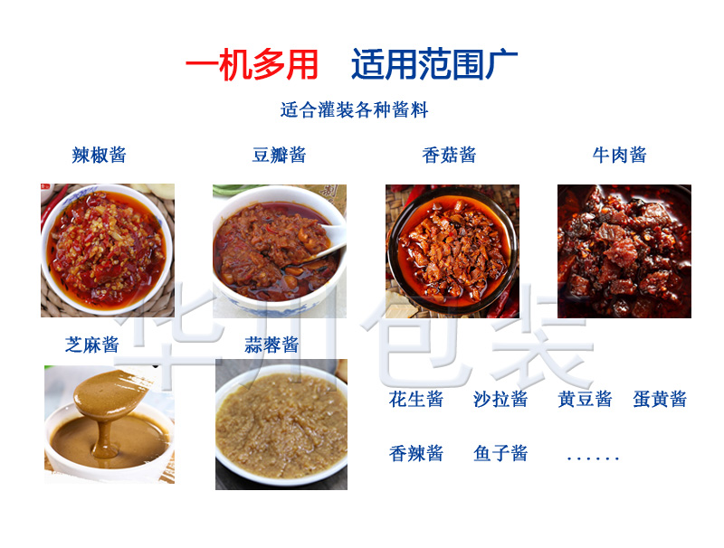 廣泛適用於各種調味料、粘稠體、膏體、半流(liú)體(tǐ)和各種(zhǒng)含顆粒物(wù)料的灌(guàn)裝。如(rú)辣椒醬、番茄醬、芝麻(má)醬、花生醬、果醬、糖漿、蜂蜜、果肉飲料以及各類膏狀物料。