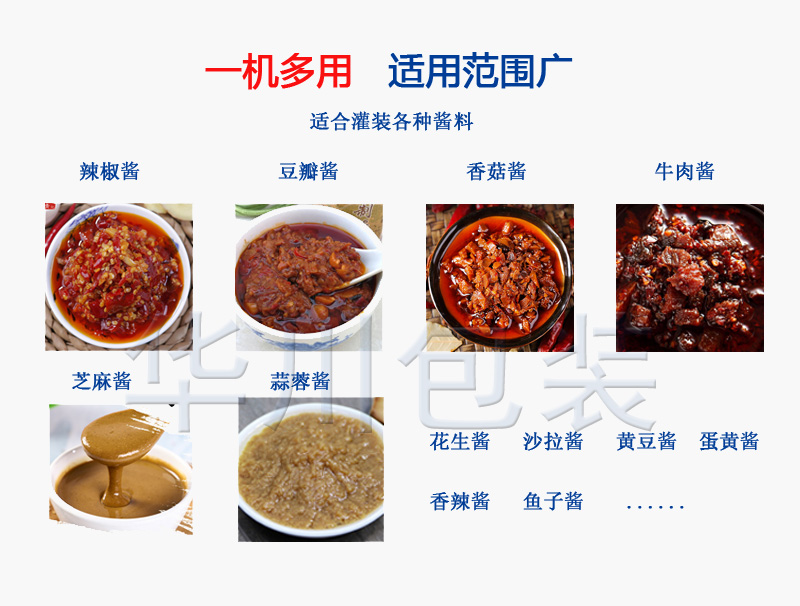 廣泛適用於(yú)各種調味(wèi)料、粘稠體、膏體、半流體和(hé)各種含顆粒物料的灌裝。如辣椒醬、番茄醬、芝麻醬、花(huā)生(shēng)醬、果醬、糖漿、蜂蜜、果肉(ròu)飲料以及各類膏狀物料(liào)。