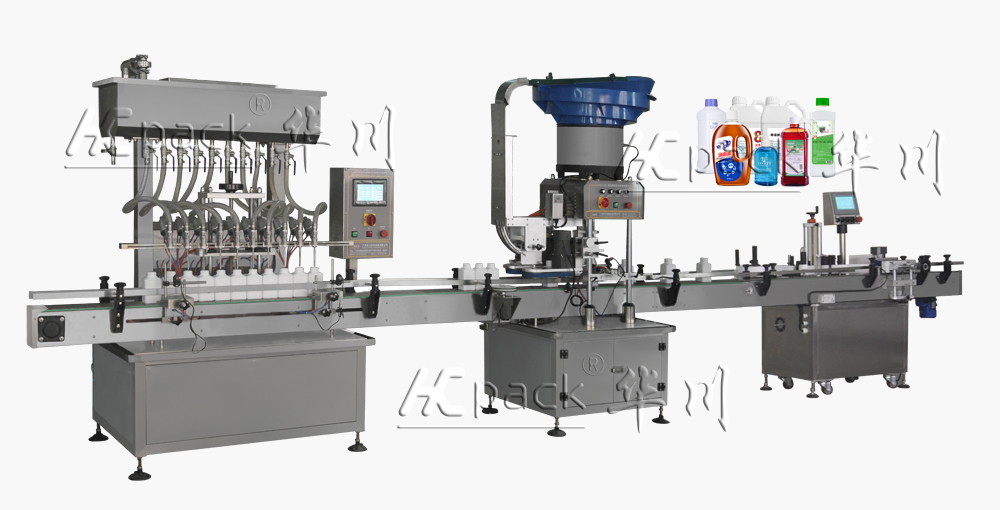 本生產線廣泛適用於日化品(pǐn)、食品、化工行業中易流(liú)動(dòng)液體(tǐ)的灌(guàn)裝、旋(xuán)(壓)蓋,貼標。